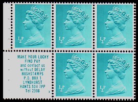In booklets DT5 to 12 the advert label was for Rushstamps. For a closer look at the 50p booklet issues click on this link For a listed and clearly evident flaw on the cylinder panes click on this link