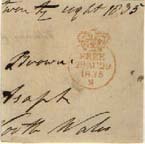 Time coded stamps were in use from 1835-1840. The mark consisted of a crowned circle containing date symbols with code letter 'M' at the bottom for 'Morning'. This piece is dated 29 AU 29 and the part manuscript at the top reads 'twenty eight 1835'. |