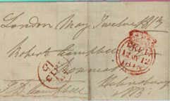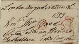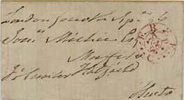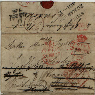 This piece makes one wonder how on earth it was delivered. It was redirected twice as is seen by the three addresses and the three 'FREE' marks. Other marks on the front are the mileage mark of 'STIRLING 20 MAR 1826 431 — - E' and Glasgow mark 'G MAR 20M 1826' plus a receiving stamp. Good luck to the Postman! |