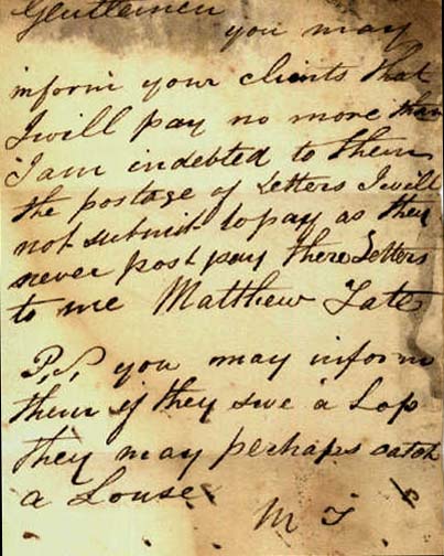 you may inform your clients that I will pay no more than I am indebted to them, the postage of letters I will not submit to pay, as they never post pay there letters to me.