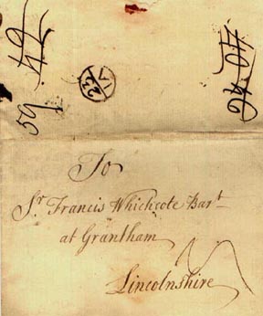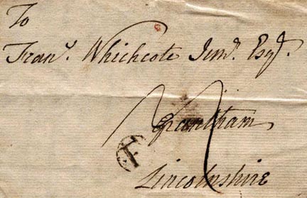 These 'Letters from the Past' are both from the 1770's addressed to Francis Whichcote of Grantham, Lincolnshire. They gave me many hours of interest researching the postal markings and the contents. The first letter is dated 23 January, 1770 — three days before the British flag was placed on Australian soil. It is clearly addressed