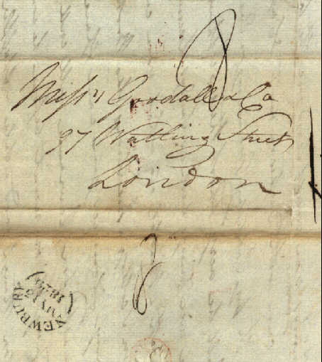 This letter is addressed to Messrs Goodall and Co of 97 Watling Street London, unlike the previous correspondence, which was addressed to Alston and Goodall, but at the same address. It is dated 13th May 1829, and has four postal markings :-