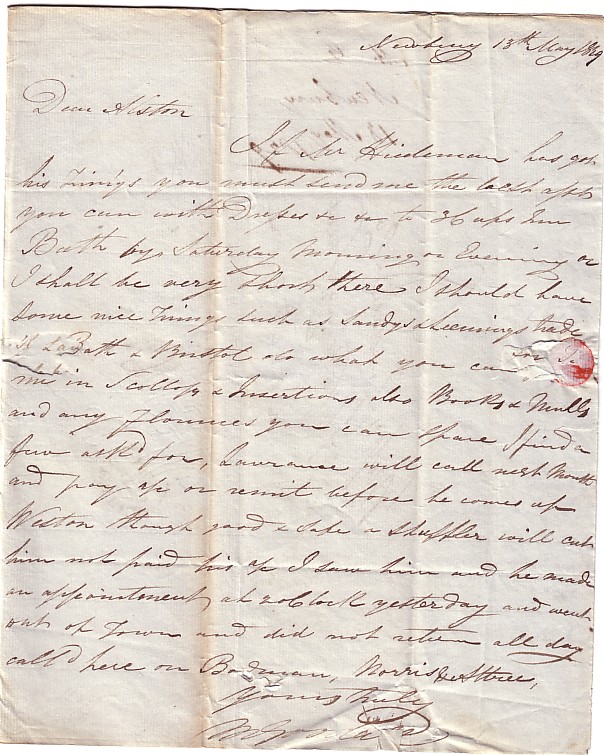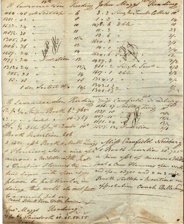 National Postal Museum postcard : 1836 : represented the culmination of 50 years of mail coach development. These two postcards were part of the set designed by Richard Blake and issued by the National Postal Museum to commemorate the 200th Anniversary of the Carriage of Mail by Coach. They were issued in July 1984. The mail coaches were the top order of coaches on the road, and they were run primarily for the transport of the mails and for passengers. They were so reliable that country towns set their clocks by their arrival. For instance, the mail coaches from London reached Reading (38 miles away) at ten past one in the morning and Newbury(55 miles) at five minutes past three in the morning. (Nearly two hours to cover 17 miles). These towns were the destination for Mr Goodall's next journey from his London Head Office. Journey to Reading & Newbury 1) a black circular provincial datestamp of Newbury May 13 1829. (This type of datestamp was allocated to towns which had an annual turnover of more than £1000. 2) a red circular double-ring morning duty stamp applied in London the next day 14 May 1829 3) and 4) manuscript charge marks 8(eightpence) — one on the front and one on the back. Eightpence was the cost of sending a single sheet letter a distance of between 50 and 80 miles. Newbury is 55 miles west of London on the Bath road. The letter is from Michael Goodall again, and he has called at various businesses in Reading on the way — as can be seen from the orders he has included on the inside of the letter. Dear Alston, If Mr. Hindeman has got his trimmings you must send me the best assortment you can with dresses etc to 3 Cups Inn, Bath, by Saturday morning, or I shall be very short there. I should have some nice trimgs (trimmings) such as Sandys and Leemings for trade in Bath & Bristol. Do what you can for me in scollops and insertions, also books and mulls and any flounces you can spare — I find a few ask'd for. Lawrence will call next month and pay a/c or remit before he comes up. Weston, though good and safe, a shuffler, will cut him — not paid his a/c. I saw him and he made an appointment at 2oclock yesterday and went out of town and did not return all day. Called here on Botman, Norris and Attree, Yours Truly M. Goodall. The orders he has taken, or items sold were to R. Lawrence & Son and John Maggs both of Reading, and Miss Camfield of Newbury. He also gives instructions as to how the goods are to be forwarded. For instance for Miss Camfield, he says send a nice assortment of narrow and middle width jaconet and cambric flounces open work and open edges and 2 or 3 nice books Scollops and insertions on approbation,Coach Belle Savage. For John Maggs of Reading 1 piece 6/4 NAINSOOK per coach. For R Lawrence and Son of Reading he wants an assortment of stripes, shaded and double glazed cambric with trimmings and flounces to be sent by coach Black Lion, Water Lane. He also adds a comment for this one — "Please be particular in doing this well, do not put too much fat on" Definitions Jaconet : Nainsook : A cotton fabric, a kind of muslin or jaconet of Indian origin Cambric : a fine white linen originally made in Cambray in Flanders, also an imitation made of hardspun cotton yarn — the material of handkerchiefs