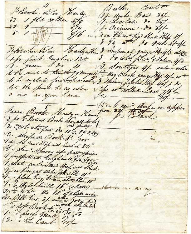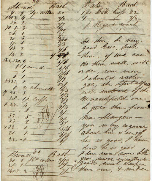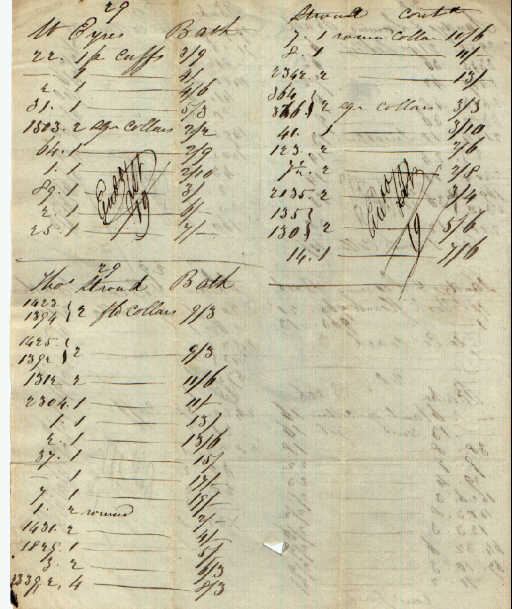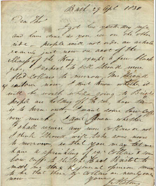 Perhaps this is another brother, working in the London office, as in the letter written by the father, quoted in the previous chapter he says 'best wishes to you and John'. The letter has a double-circle date stamp of Bath AP 29 1830, in black and a manuscript charge of 9 — the correct charge for a single sheet Bath to London — (which has also been written on the back), and a red morning-duty receiving stamp applied in London AP 30 1830. There is no mention of Mr Knight, but as it is three months since the last letter, things must have been settled amicably, and it is back on the road for the Alston commercial traveller. I got here yesterday safe and have done as you see on the other side — people will not order an article scarcely just now on acct of the illness of the King — except a few black gros, I expect to sell Stroud more flat collars tomorrow — rs Stroud is in town now, I don't know whether it will be worthwhile going to Bristol people are holding off to see how this is to turn out. I want some low cuffs very much I don't know whether I shall require any more collars or not. I think Stroud will take some more tomorrow, so that you may let me have a sprinkling of Sqr collars and some low cuffs to the White Hart Bristol to meet me there. The general opinion seems to be that these sqr collars are nearly over now. Yours. J. Alston The orders he has managed to obtain were dated 28th: Sandys & Leeming for scollops, insertions and collars, plus Book flounces to be forwarded per Co's coach : Baker of Bath, sewn collars, and square collars. Then on the 29th to Shaw & Beal of Bath, collars and cuffs : Mr Eyres of Bath, cuffs and square collars : Thos Stroud of Bath flat, round, sewn and square collars. So although he felt he had not been successful, his total sales were quite reasonable. The general problem was the imminent death of the King. Although this is not quite so pronounced nowadays, in the 19th century the death of the Monarch was acknowledged by wearing mourning clothes of black for a certain length of time, and then gradually it was permitted to wear grey or lilac, and then ease back into coloured clothing. As the King was known to be fatally ill, no shopkeeper was prepared to spend money on stock that would not be sold — which is good business sense. ( As an aside :- as late as 1952 when the death of King George VI was announced the whole of London came to a halt, and traffic stopped, drivers got out of their cabs and passengers stood up in buses in respect — a staggeringly moving response to the death of a modern Monarch.) The next letter is dated the next day, and has similar postal markings, the Bath double-circle date stamp Ap 30, 1930, a poor strike of the London morning-duty receiving datestamp 1 May 1830 and two manuscript markings — 9, the correct charge mark and then on the back, 2/1, which is inexplicable. There is no mention in the letter of anything being enclosed, which would increase the weight or contents, and even if it had, it would not be that price, as it would have to be units of 9d — i.e. 1/6d, 2/3d — not 2/1d. The letter begins ... Dear Thos. I have almost finished with Bath now and am just going off to Bristol — the accounts of the King's illness are so unfavourable this morning that people will neither buy nor order. If I find things in Bristolto be bad it will be of no use staying there spending money, I shall leave on Saturday afternoon, but I shall see when I go over. I have yours this morning. The patterns are very pretty but they will not order till they see how things come round. Yrs truly. J. Alston He has listed the orders on the back — (see letter illustrated) showing that he went back to Mr Stroud on the 29th and the 30th, and also to Mr Baker and sold them some more collars and chemisettes. For Mr Baker he gives instructions to send some black grosgrain per Regents Coach. He then adds ... Let these be very good gros, pick them, if we can do them well, he will order some more. I should rather get the Spitalfields silks instead of the Macclesfield ones. He gets them from Mr Hangers — you may enquire about him and see if he is good. I have heard he is good. I have seen some black gros, it was excellent goods, much cheaper then ours and wider. We must get the Spitalfields one and I think with them we may do some good just now owing to the illness of the King people are buying black gros just now. Another interesting point is the evidence that the orders have been entered in the ledgers at the head office. Each of the orders has been annotated — "ENTD TSA" presumably signifying that Thomas is doing the book-keeping in the London Office at this time. I still do not know what the reference numbers mean, but assume they are identifying codes for patterns, or material or size or colour. Note that he says he got his brother's letter with the samples — it is obvious that the mail and parcel service is reliable and trusted. Travelling salesmen such as these, could not have operated successfully, if they were unable to carry samples with them, and know that the orders they posted away would be received and despatched. The mail and parcel services expanded to meet these demands.
