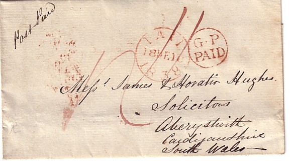 click here for details | This letter was written to Messrs James & Horatio Hughes, Solicitors Aberystwith Cardiganshire South Wales. Note that the writer has inscribed on the front top left corner Post Paid. |