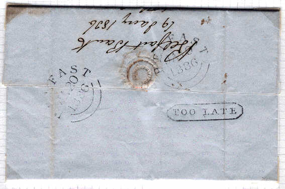 This one was posted in Belfast, addressed to James Thomson Esq, in Ballymonly, and has a black, circular dated postmark of JA 19 1836. It also has another for the next day BELFAST JA 20 1836, and the TOO LATE stamp applied to show why it had been delayed. This example is a single straight line with an octagonal frame measuring 1-3/8" by ¼". Many Irish post offices used this type of mark in various sizes and colours.