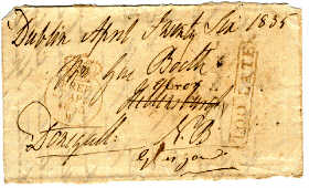 This is an example from Dublin in 1835 — another Free 'front'. This is signed by Donegall addressed to Hillsborough, Glasgow, and dated Dublin April Twenty Six 1835. Notice that this has a totally different crown, and a boxed, straight-line 'TOO LATE' stamp applied in red ink.
