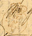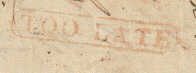 This is a totally different example of an Irish TOO LATE mark. This was applied in red ink, and is a scroll shape, which was in use in Dublin during the 1820's and 1830's.