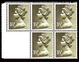 3½p UB43 cylinder B1, (FCP PVA) with blank label, is listed with APPL perforation type only and I have no examples(*) 3½p UB44 cylinder B1, (FCP PVAD) with blank label, is listed with APPL perforation type only and is illustrated below.