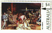 20mm. long white flaw in the centre background, above shearers head, which gives the impression of broken woodwork along the back of the shearing shed.