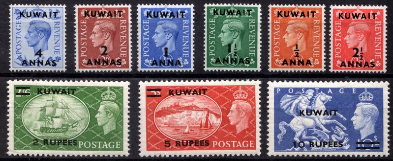 This is an independent Arab sheikhdom, the richest oil state in the Arabian Gulf. It has a very interesting postal history, including a desert express camel service operated by the East India Company in the late 18th century. Fearing Turkish attack, Kuwait sought a treaty of protection with Britain in 1899, reaffirmed in 1914 and again by treaty in 1961, which is why the British stamps were overprinted. The currency was Indian (annas and rupees) until 1961 when it was changed to 1000 fils = 1 Kuwait dinar. the postal administration was operated under British administration from 1st April 1948 until 31 January 1959. This set of nine values was issued 1950-51