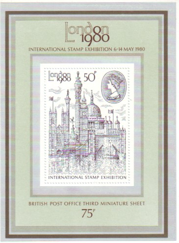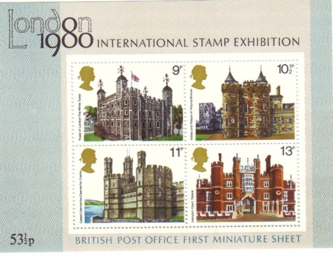 The British Post Office has agreed to help the London 1980 Exhibition by providing means of financial support. The whole of the premium on each sheet (the amount in excess of the face value of the four stamps) will be available to help finance the 1980 Exhibition; any money not required for this purpose will be put into a special fund for philately. The first miniature sheet issued contained the four stamps of the 1978 British Architecture, Historic Buildings set issued on March 1978.
