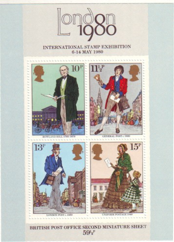The London 1980 Stamp Exhibition also introduced the idea of a miniature sheet of stamps from the British Post Office, and the reason for this was explained on the backing sheet for each of them.