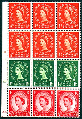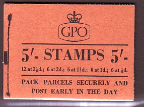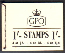 The value of the booklets issued during the Wilding period varied from this type of 1/- in a small plain cover with 12 panes of 2 stamps : 4 x 1½d 4 x 1d and 4 x ½d, to a 10/- value containing 6 at 1d, 6 at 3d and 24 at 4d stamps in panes of 6 with or without adverts.