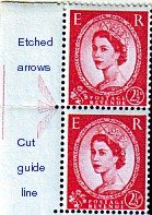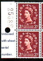 These large circular punched holes occur on all reel-fed printings in various positions. They are an indication of the type of perforator used. They occur unboxed, in a single box and also in double boxed. The 2d stamp on the left also shows a sheet number.