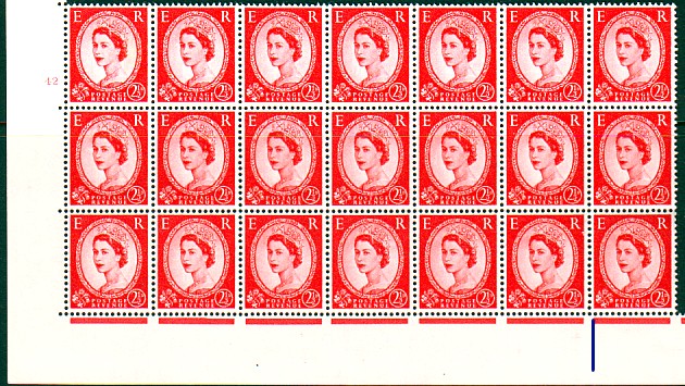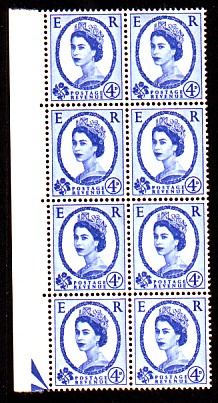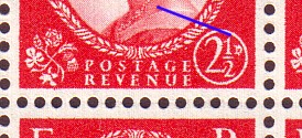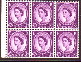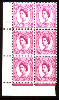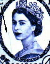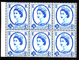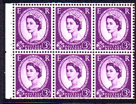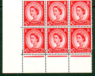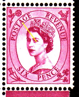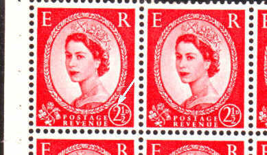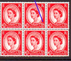 Row 1 stamp 3 in this block of six there is a scratch above the Queen's eyebrow.