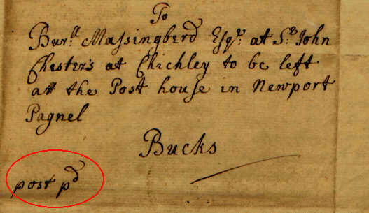 Many of the letters in our collection are unpaid. Those that have been pre-paid usually have a note to that effect on the front address panel, by the writer of the letter. This letter of 1717 is such an example