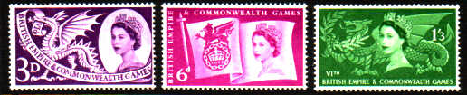 18 July 1958 Sixth British Empire and Commonwealth Games, Cardiff. Designers : Reynolds Stone (3d)[320,400,000], W.H.Brown (6d)[28,595,880] Pat Keely (1s3d)[9,970,000]