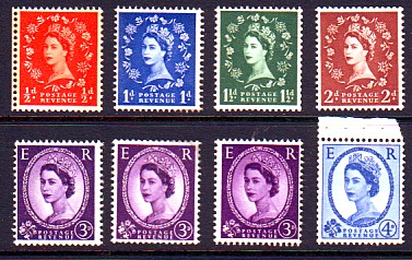 This is the set issued in 1960 on the phosphor lined paper. It is very difficult to show phosphor lines on a webpage, as it is best seen using a special lamp.The three 3d stamps have different bands and placed differently. From the left,2 bands, 1 band at the side, one band in centre.