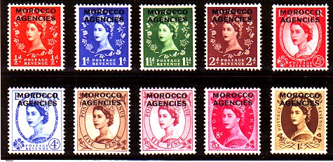 Stamps used at British postal agencies in Morocco, N. Africa, which became an independent kingdom in 1956, but some of the British issues continued in use until 1957. This set was the 1952-54 issue of 10 values on the Tudor Crown watermarked paper.