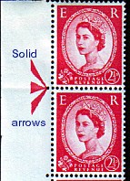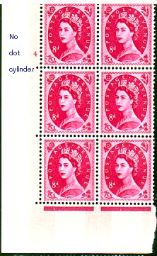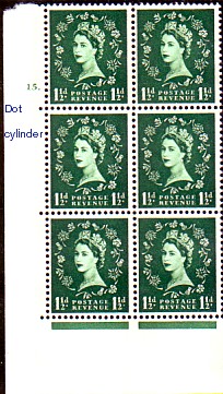 Compared to the George VI period a wide variety of markings have been introduced in the Elizabethan issues to facilitate new elements such as registration of multicoloured stamps, ensuring that the cylinders are applied in the correct sequence, aids to registration of perforation, colour dots to ease checking for omission of colours and so on. The writing on the margins on these illustrations have been applied only to the scanned images, not on the stamps themselves.
