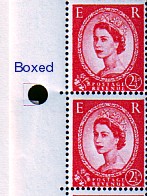 These large circular punched holes occur on all reel-fed printings in various positions. They are an indication of the type of perforator used. They occur unboxed, in a single box and also in double boxed. The 2d stamp on the left also shows a sheet number.
