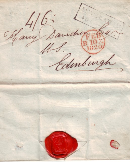 Harry Davidson Esq Writer to the Signet, Edinburgh  From Duncan Campbell, Inveraray, 1820 This letter is written on a very large sheet of paper with a very interesting watermark.   The letter is sealed with the use of a beautiful signet ring, which has what looks like a swan standing with a motto above the head BE MINDFUL and at the bottom of the seal, the initials D C in a very fancy script. These are obviously the writer Duncan Campbell’s initials.     2) the charge mark of 4/6-1/2, which would have had to be paid by the addressee, and then 3) the Circular date stamp from Edinburgh on arrival FEB 10 1820 with B on the left to identify the hand stamp and M on the right to show it was dealt with in the morning.