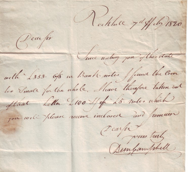 Rockhill 7d ffeby 1820 This postage charge seems enormous, and to work out the cost, the mileage involved has to be known. The distance between these two towns via Glasgow, is about 110 miles, within the range of 80 to 120 miles which is a basic cost of 9d. So to make up the 4/6 this would be 6 times the basic rate, plus the additional halfpenny Scottish mail tax. The contents of the letter explains why it was charged so much above the basic rate. So the answer to the high cost of postage is that this sheet of paper would have been folded and would have held 20 of the English Five-Pound notes, which counted as an enclosure and would then be weighed to work out the charges. There was a daily mail coach between the two places, and on the map it does not look to be a great distance. A perfect temptation to the rogues who held up the mail coaches to rob the contents of the mail bags.  |