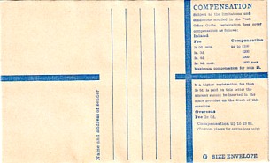 September-November 1968. 3/4d Grey plus Blue circle MINIMUM EXTRA POSTAGE 1d. "Compensation up to £2/18/-" on back. (Image reduced to 50%)