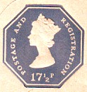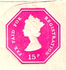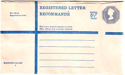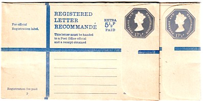 February 15th 1971. 17½p Grey (shades) plus blue "EXTRA 5½p PAID". Note on the back includes "overseas/until 1st July 1971 the fee is 15p..."