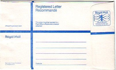 September 23rd 1986. Queen's Head omitted. Royal Mail/1/GREAT BRITAIN/MINIMUM POSTAGE AND/REGISTRATION FEE PAID.