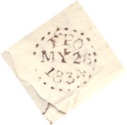 The next change in the datestamps occurred in 1816, when the outer circle was a dotted line, and the words were reduced to the initials F P O. The size varied from 21 to 24mm — and it was in use until 1836. These two examples are dated 1826 and 1834 | |