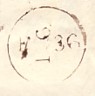 | This second example is on a letter with so many other marks it is surprising that the address could be made out at all. The circular frame on this one is 23mm and the details are F for Foreign, 36 for the year and the numbers 16 in the centre. This is another example where it looks as though the number 16 in the middle could be 1st day of 6th month, but the letter was dated May 25th, and it would not have taken 7 days to get from Chester to London, so that is another idea shot down in flames.