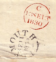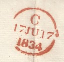 ![]() ![]() | two examples showing the letters B (Oxford to London, 1836) and C (Plymouth to London, 1830)in the datestamps. This code letter only identified the table at which the letters were sorted, or the clerk using the stamp at the time. |