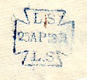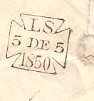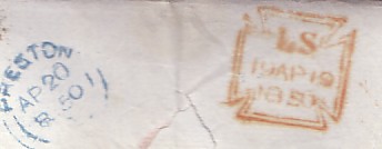 This letter dated April 19th 1850 has a Type 4b stamp in use from January 1850 to March 1854. This type has a new frame size 25 x 25.5. The date is sanserif, 'LS' is 5mm high and the year is high in the frame. It is interesting to note that the blue Preston stamp has the figures of the year reversed and it reads 8150 instead of 1850