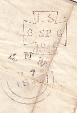 This cover bears a variant of the Type 3 basic design and is listed by Hawkins as type 3c unpaid mark of Lombard Street dated 6th September 1844. The basic design was in use from January 1834 to May 1857 and type 3c from January 1843 to August 1849. The frame was 21 x 21.5 with cruciform design and the height of the year figures was 4.5 mm.
