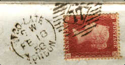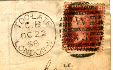 The double circle 'TOO LATE G.P.O. shows it was posted in London and further substantiation is in the stamp obliterator. This type of number within a diamond, set in an oval of parallel bars was used only at the Inland Office of the General Post Office in London. The number (in this case 4) did not signify an office, only the number of the actual handstamp which was being used. A later version in use at the Inland Office had TOO LATE LONDON (notG.P.O.)as part of the date stamp. this was posted in 1858.