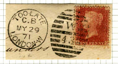 The London District post had distinctive cancellations, and the first example shows the TOO LATE G.P.O. as a separate small circular stamp, and the double date stamp shows it was posted in the WC 26 district. The second one shows TOO LATE LONDON W incorporated into the double datestamp — posted in the West 43 district. Note that the Penny red stamp is perforated on both these examples.